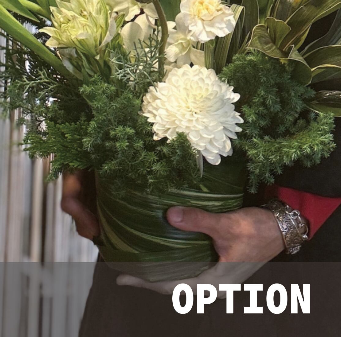 器に葉っぱを巻きます。なんてことないと思いきや、初めて見ると結構斬新で「一味違う感」を演出できます。リピートだと「やっぱこれだよね感」が作れます。大変オススメのオプションでございます。